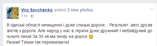 "В Одесской области нечищенные и очень скользкие дороги ... Результат: авто друзей слетело с дороги. Но народ у нас в Украине очень дружный! И неравнодушен к чужой беде! За 30 мин мы снова на дороге :)", - написала Вера Савченко.